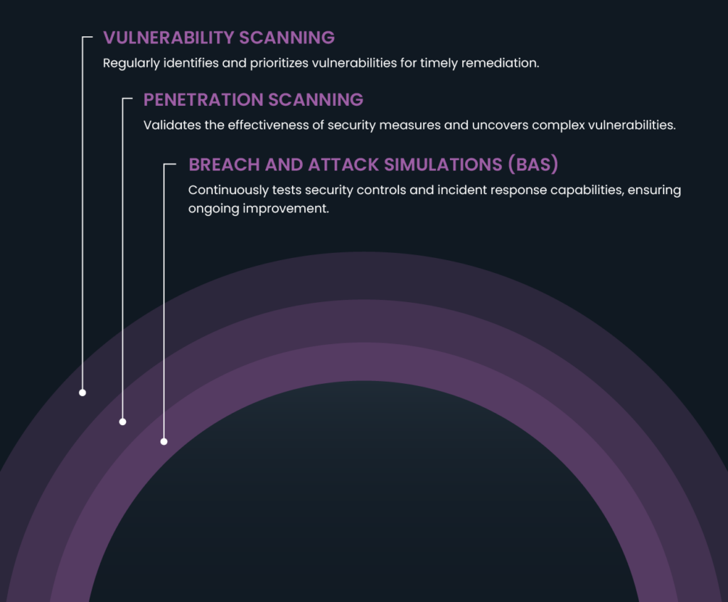 - Validation: Use vulnerability scanning, penetration testing, and breach and attack simulations (BAS) to identify and validate vulnerabilities, test security controls, and simulate attack scenarios.